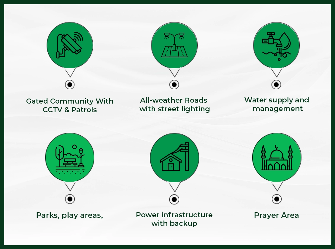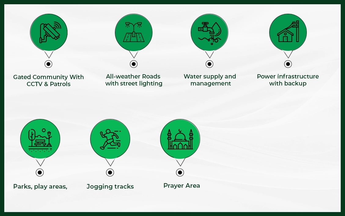 The plan places streets and plots so most homes face light and views while traffic flow stays simple. Access roads connect quickly to the main approach, and plot fronts are kept clean for parking and entry. Services run along planned corridors for power and water, with green pockets spread across the map. The plan includes a 50-kanal clubhouse in a central, easy-to-reach zone and a dedicated mosque for daily use. Streets are paved and the internal road network is under active development to keep movement simple. Residential and commercial plots are arranged along view-friendly streets with green pockets between clusters. Power and water corridors follow planned routes so services remain organized as the phase grows.