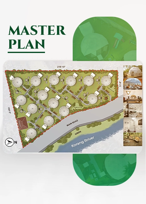 The master plan of Nestora Glamps is planned so every unit enjoys a clear valley outlook with views toward the river, and the arrangement protects sightlines so one unit does not block another. Circulation paths and utility lines run behind the glamps for clean fronts and simple access. About 50% of the land is reserved for green and open space to keep light, air, and privacy intact.